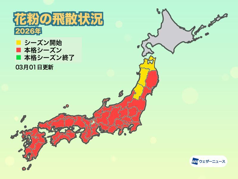 3月に入り、寒暖の変動が大きく関東甲信、北陸から東北の飛散開始はおおむね例年並みとみられます。